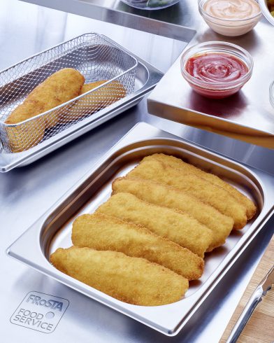 ALASKA-SEELACHS-FILET (57%), Mehl (WEIZEN (für CH: Weissmehl (WEIZEN), Mais), Wasser, Rapsöl, Speisesalz, HÜHNEREIPULVER, modifizierte Maisstärke, SENFMEHL, Zucker, Backtriebmittel: Diphosphate, Natriumcarbonate, WEIZENSTÄRKE, Dextrose.