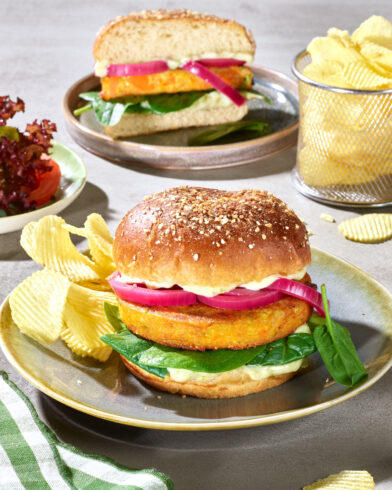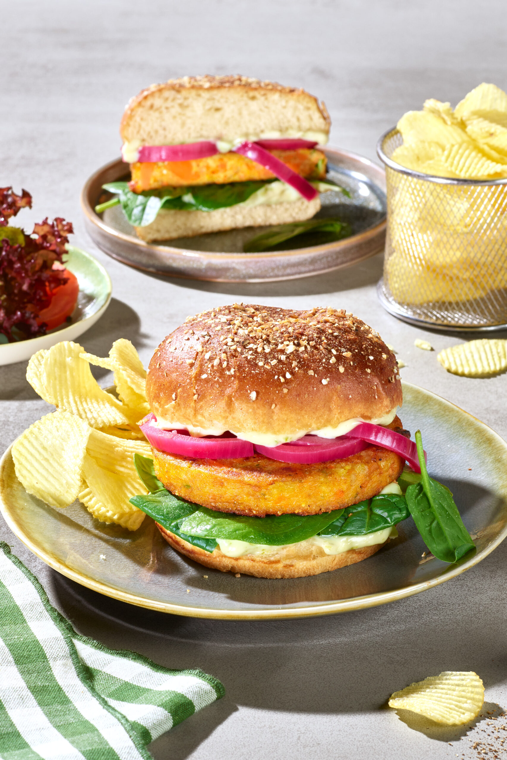 Aromatischer veganer Burger aus Süßkartoffeln und Amaranth, fein verfeinert mit erlesenen Gewürzen und tiefgefroren.