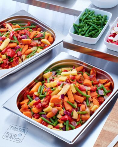 Grobstückige Gemüsemischung aus knackigen Karotten, Pastinaken, gegrillter Paprika, edlen Prinzessbohnen und roten Zwiebeln. Verfeinert mit feiner Butter und ausgesuchten Gewürzen. Tiefgefroren.