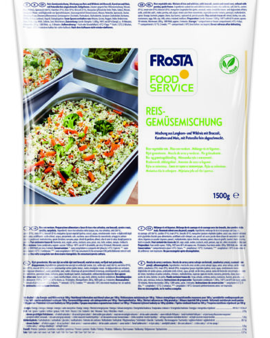 gegarte Reis-Wildreismischung (Wasser, Reis, Wildreis, Speisesalz) (66 %), Karotten (9 %), Mais (9 %), Broccoli (8 %), Margarine (pflanzliche Fette (Palm, Kokos), Wasser, Emulgator Mono- und Diglyceride von Speisefettsäuren, Säuerungsmittel Citronensäure), Wasser, Petersilie, Speisesalz, Zucker, Zitronensaft aus Zitronensaftkonzentrat, Gemüsepulver (Zwiebeln, Pastinaken), Maltodextrin, Gewürze (Liebstöckel, Kurkuma, Pfeffer, Nelken, Lorbeer), Rapsöl, Steinpilzpulver.