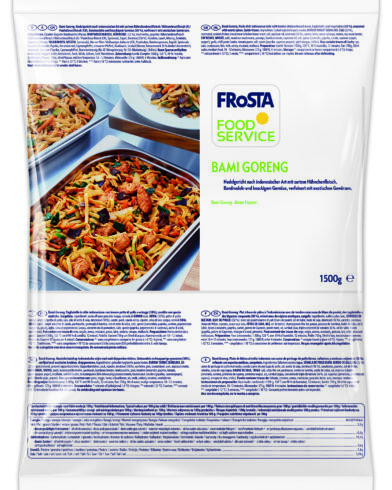 Gegarte Bandnudeln (Wasser, HARTWEIZENGRIESS, HÜHNEREI) (32 %), mariniertes, gegartes Hähnchenbrustfleisch (Hähnchenbrustfleisch / H ühnerbrustfleisch (A) / Pouletbrustfleisch (CH), Speisesalz, Sojaöl, Dextrose) (16 %), Karotten, Lauch, Wirsing, Zwiebeln, Sojasauce (Wasser, SOJABOHNEN, WEIZEN, Speisesalz), Mu-err-PiIze / Vielhaariges Judasohr (CH), Pastinaken, Bambussprossen, Rapsöl, Speisesalz, Gewürze (Koriander, Paprika, Kreuzkümmel, Cayennepfeffer, schwarzer Pfeffer), Knoblauch, Sambal (Wasser, Tomatenmark 36 % dreifach konzentriert, Speisesalz, Gewürze (Paprika, Cayennepfeffer), Branntweinessig (für AT: Weingeistessig, für CH: Alkoholessig), Chillies).