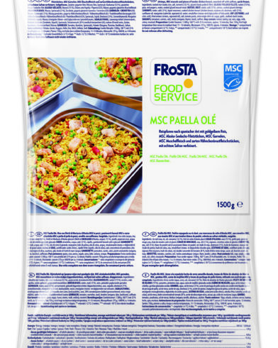 Zutaten: gegarter Reis (Wasser, Reis, Speisesalz, Kurkuma) (52 %), glasiertes Alaska-Seelachs-Filet (ALASKA-SEELACHS, Wasser) (15 %), Erbsen, rote Paprika / Peperoni (CH), Wasser, gegartes glasiertes Muschelfleisch (MUSCHELFLEISCH, Wasser, Speisesalz) (3 %), Zwiebeln, gegarte glasierte Garnelen / Crevetten (CH) (GARNELEN / CREVETTEN (CH), Wasser, Speisesalz) (3 %), flüssig gewürztes, gegartes Hähnchenbrustfleisch / Hühnerbrustfleisch (A) / Pouletbrustfleischerzeugnis (CH) (Hähnchenbrustfleisch / Hühnerbrustfleisch (A) / Pouletbrustfleisch (CH), Speisesalz, Sojaöl, Dextrose) (3 %), Sonnenblumenöl, Margarine (Palmfett, Rapsöl, Wasser, Emulgatoren (Mono- und Diglyceride von Speisefettsäuren, SOJALECITHINE), Säuerungsmittel Citronensäure), frittierte Zwiebeln (Zwiebeln, Rapsöl), Speisesalz, Tomatenmark (28 % zweifach konzentriert (A)), natives Olivenöl extra, Zucker, Knoblauch, Krustentierfond (Wasser, GARNELEN, Tomaten, Karotten, Speisesalz), Kräuter (Oregano, Thymian, Basilikum), Safran.