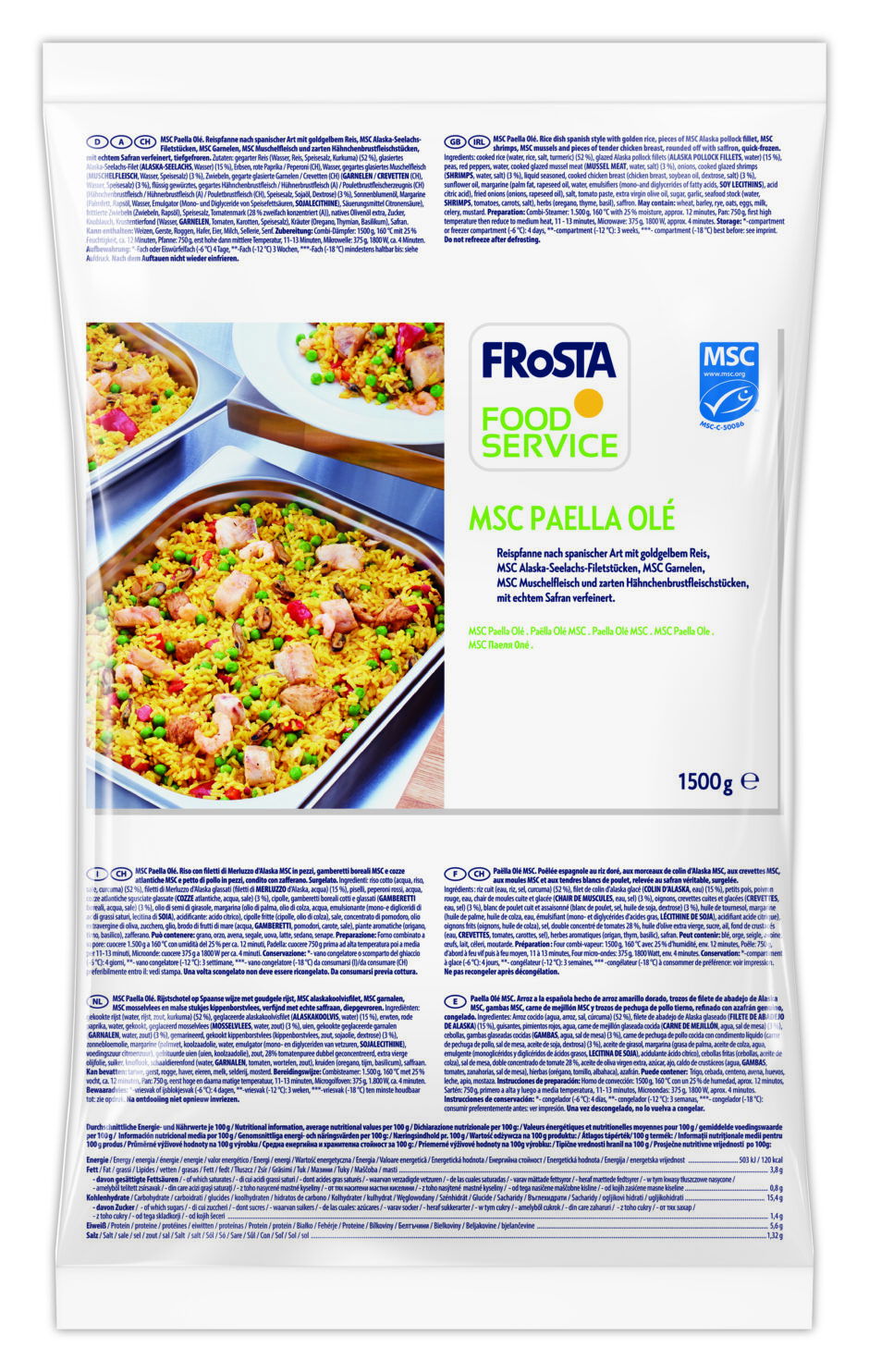 gegarter Reis (Wasser, Reis, Speisesalz, Kurkuma) (52 %), glasiertes Alaska-Seelachs-Filet (ALASKA-SEELACHS, Wasser) (15 %), Erbsen, rote Paprika / Peperoni (CH), Wasser, gegartes glasiertes Muschelfleisch (MUSCHELFLEISCH, Wasser, Speisesalz) (3 %), Zwiebeln, gegarte glasierte Garnelen / Crevetten (CH) (GARNELEN / CREVETTEN (CH), Wasser, Speisesalz) (3 %), flüssig gewürztes, gegartes Hähnchenbrustfleisch / Hühnerbrustfleisch (A) / Pouletbrustfleischerzeugnis (CH) (Hähnchenbrustfleisch / Hühnerbrustfleisch (A) / Pouletbrustfleisch (CH), Speisesalz, Sojaöl, Dextrose) (3 %), Sonnenblumenöl, Margarine (Palmfett, Rapsöl, Wasser, Emulgatoren (Mono- und Diglyceride von Speisefettsäuren, SOJALECITHINE), Säuerungsmittel Citronensäure), frittierte Zwiebeln (Zwiebeln, Rapsöl), Speisesalz, Tomatenmark (28 % zweifach konzentriert (A)), natives Olivenöl extra, Zucker, Knoblauch, Krustentierfond (Wasser, GARNELEN, Tomaten, Karotten, Speisesalz), Kräuter (Oregano, Thymian, Basilikum), Safran.