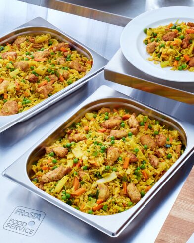 Gegarter Reis (Wasser, Reis, Speisesalz) (33 %), mariniertes, gegartes Hähnchenbrustfleisch (Hähnchenbrustfleisch / Hühnerbrustfleisch (A) / Pouletbrustfleisch (CH), Speisesalz, Sojaöl, Dextrose) (17 %), Erbsen, Karotten, Lauch, Mungobohnenkeime, Wirsing, Zwiebeln, Bambussprossen, Rapsöl, Sojasauce (Wasser, SOJABOHNEN, WEIZEN, Speisesalz), Speisesalz, Curry (Kurkuma, Kreuzkümmel, Koriander, SENFSAAT, Cayennepfeffer, Fenchel, Bockshornkleesamen), Zucker, Kokosraspel, Knoblauch.