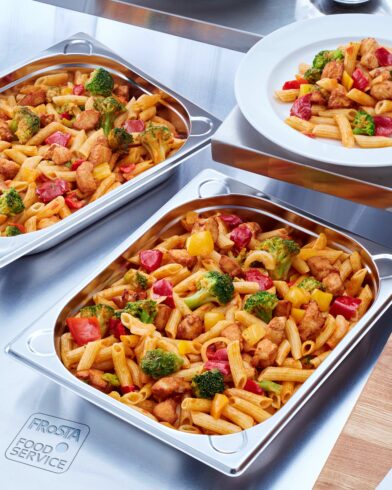 gegarte Penne-Nudeln (Wasser, HARTWEIZENGRIESS) (30 %), mariniertes, gegartes Hähnchenbrustfleisch / Hühnerbrustfleisch (A) / Pouletbrustfleisch (CH) (Hähncheninnenfilet / Hühnerbrustfleisch (A) / Pouletbrustfleisch (CH), Speisesalz, Sojaöl, Dextrose) (14 %), frittierte rote Paprika / Peperoni (CH) (Paprika / Peperoni (CH), Sonnenblumenöl), Tomaten, Broccoli, Zwiebeln, gelbe Paprika / Peperoni (CH), SCHLAGSAHNE / RAHM (A/CH), Wasser, Rapsöl, Tomatenmark 28 % zweifach konzentriert, Speisesalz, Knoblauch, Gewürze (Paprika, Cayennepfeffer, Liebstöckel, Kurkuma, Pfeffer, Nelken, Lorbeer), Zucker, Gemüsepulver (Zwiebeln, Pastinaken, Karotten), Maltodextrin, Steinpilzpulver, Petersilie.