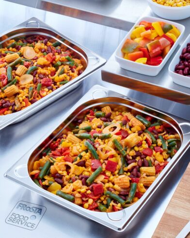 rote und gelbe Gemüsepaprika / rote und gelbe Peperoni (CH), gegarte Kidney-Bohnen (Wasser, Kidney-Bohnen), Mais, Brechbohnen / Fisolen (A), Zwiebeln, Maiskölbchen, Margarine (pflanzliche Fette (Palm, Kokos), Wasser, Emulgator Mono- und Diglyceride von Speisefettsäuren, Säuerungsmittel Citronensäure), Rapsöl, Speisesalz, Gewürze (Paprika, Cayennepfeffer, Liebstöckel, Kurkuma, Pfeffer, Nelken, Lorbeer), Zucker, Tomatenpulver, Sambal (Wasser, Tomatenmark / Tomatenmark 36 % dreifach konzentriert (A), Speisesalz, Gewürze (Paprika, Cayennepfeffer), Branntweinessig / Weingeistessig (A) / Alkoholessig (CH), Chillies), Knoblauch, Maltodextrin, Gemüsepulver (Pastinaken, Karotten), Steinpilzpulver, Petersilie.