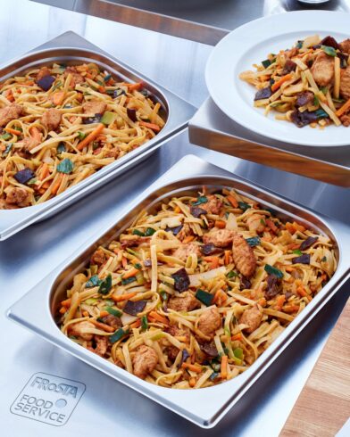 Gegarte Bandnudeln (Wasser, HARTWEIZENGRIESS, HÜHNEREI) (32 %), mariniertes, gegartes Hähnchenbrustfleisch (Hähnchenbrustfleisch / H ühnerbrustfleisch (A) / Pouletbrustfleisch (CH), Speisesalz, Sojaöl, Dextrose) (16 %), Karotten, Lauch, Wirsing, Zwiebeln, Sojasauce (Wasser, SOJABOHNEN, WEIZEN, Speisesalz), Mu-err-PiIze / Vielhaariges Judasohr (CH), Pastinaken, Bambussprossen, Rapsöl, Speisesalz, Gewürze (Koriander, Paprika, Kreuzkümmel, Cayennepfeffer, schwarzer Pfeffer), Knoblauch, Sambal (Wasser, Tomatenmark 36 % dreifach konzentriert, Speisesalz, Gewürze (Paprika, Cayennepfeffer), Branntweinessig (für AT: Weingeistessig, für CH: Alkoholessig), Chillies).