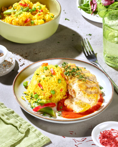 Gegarter Reis (Wasser, Reis, Speisesalz, Gewürze (Kurkuma, Safran), enthält Sonnenblumenöl und/oder Rapsöl) (49%), Zwiebeln, Tomaten, rote Paprika / Peperoni (CH), Romanobohnen, Erbsen, BUTTER, enthält Sonnenblumenöl und/oder Rapsöl, Speisesalz, Tomatenmark / Paradeismark 28% zweifach konzentriert (A), Olivenöl, Kräuter (Basilikum, Thymian, Petersilie), Zucker, Knoblauch, MILCHZUCKER, Gewürze (Liebstöckel, Macis, Nelken, Wacholderbeeren), Lauchpulver.