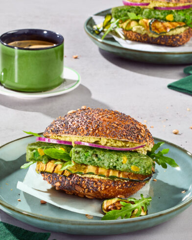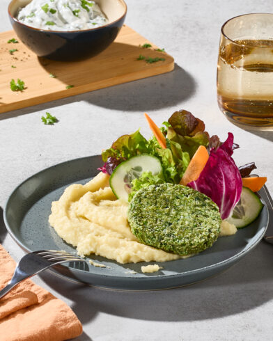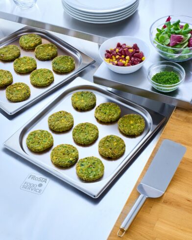 Vegetarisches Gemüse-Patty mit einer würzigen Mischung aus Erbsen, Mais, Champignons und Spinat kombiniert mit gekochtem Reis und Haferflocken, verfeinert mit Edamer-Käse & Crème fraîche sowie ausgewählten Gewürzen. Die saftige Veggie-Frikadelle mit merkbaren Gemüsestücken ist fest in der Konsistenz, vorgebraten & tiefgefroren.