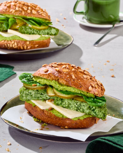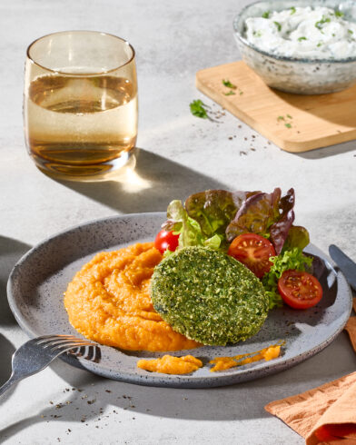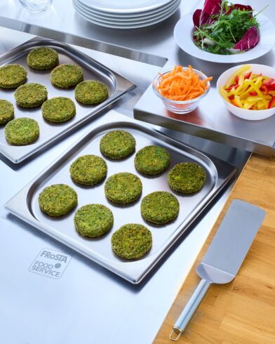 Veggie Gemüsefrikadelle in Burgerform mit einer leicht würzigen Mischung aus Erbsen, Broccoli, Grünkohl und Blattspinat, kombiniert mit Haferflocken, verfeinert mit Petersilie und Amaranthflocken sowie ausgewählten Gewürzen. Die saftige Veggie-Frikadelle mit kleinen Gemüsestücken ist fest in der Konsistenz, vorgebraten & tiefgefroren.